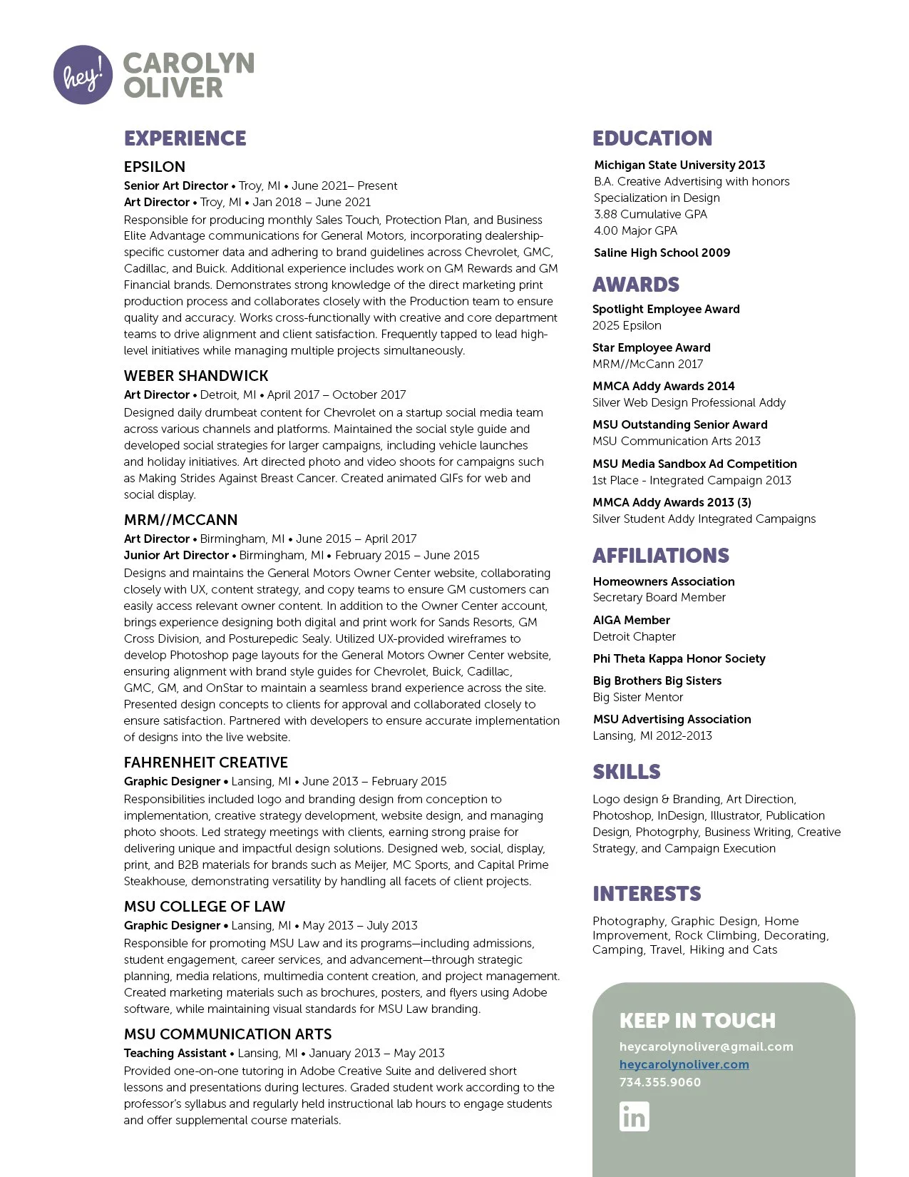 “Carolyn has a strong grasp of highly complicated, interconnected and detailed digital assignments. And she manages them effectively, even under tight timelines. I’ve seen her take difficult and sometimes ambiguous feedback and come up with great design solutions that work for everyone.”
